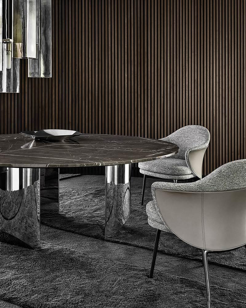 Backrest and seat cushions in channeled goose down (Assopiuma Gold Label certified) undergo routine sanitization as specified in EC Regulation No. 1069/2009, with variable-density polyurethane foam insert for added softness. The seat cushion and its internal casing are crafted with a subtle quilted pattern with double embroidery and quilt stitching that highlights the linear yet soft shape of the seat.