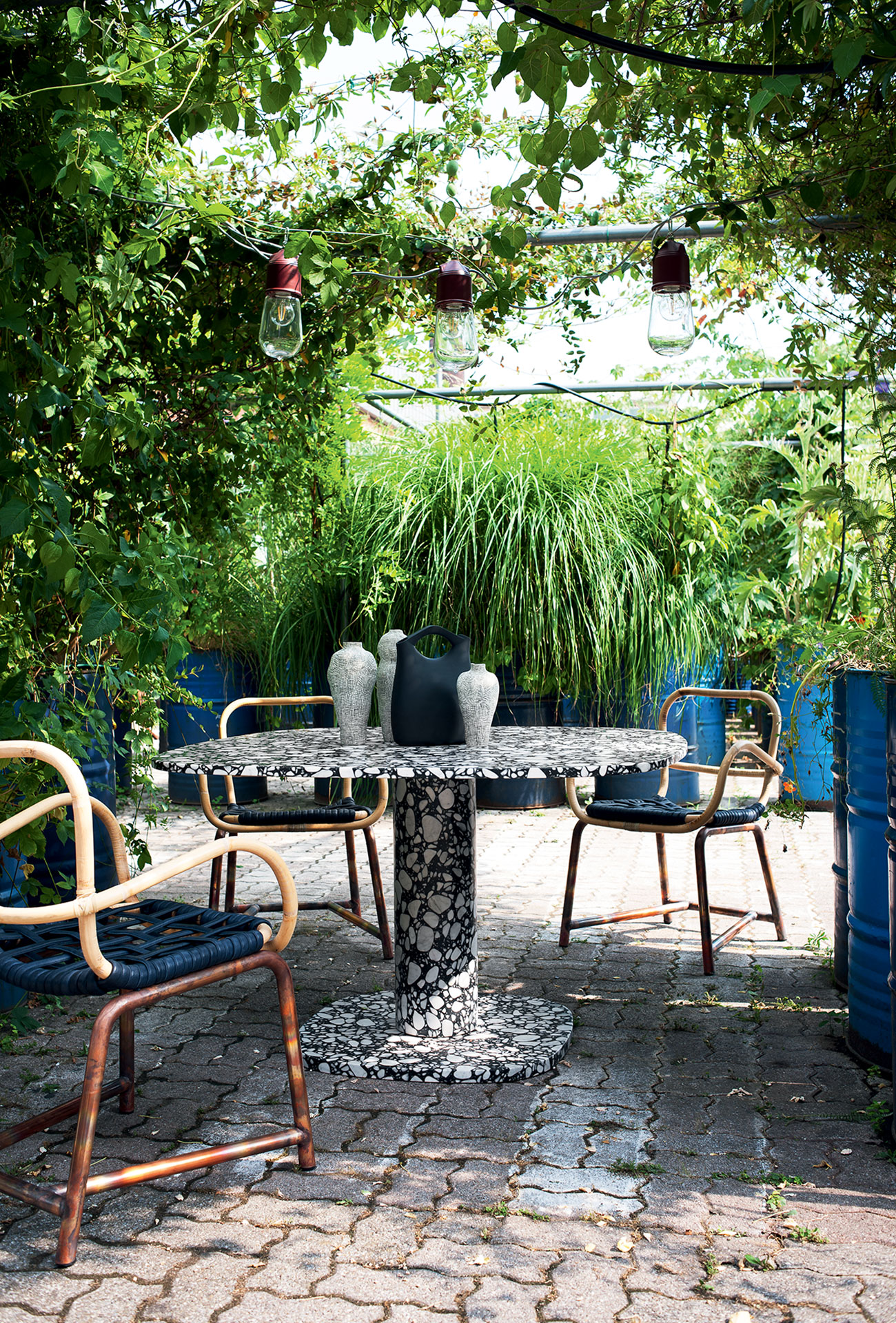 Weight-bearing blades in extruded brushed aluminium with polished varnished Brandy colour finish. Black polyethylene glides. The exclusive “Brandy” varnished finish, developed by MEII Studio, is achieved through an exclusive high-quality hand-finishing process that emphasizes the polished brushed aluminium texture, including possible natural nuances that make each piece unique.