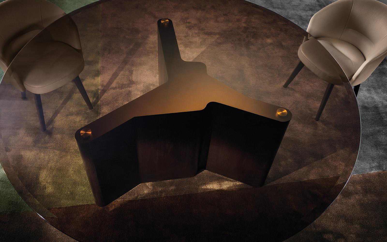 Weight-bearing blades in extruded brushed aluminium with polished varnished Brandy colour finish. Black polyethylene glides. The exclusive “Brandy” varnished finish, developed by MEII Studio, is achieved through an exclusive high-quality hand-finishing process that emphasizes the polished brushed aluminium texture, including possible natural nuances that make each piece unique.