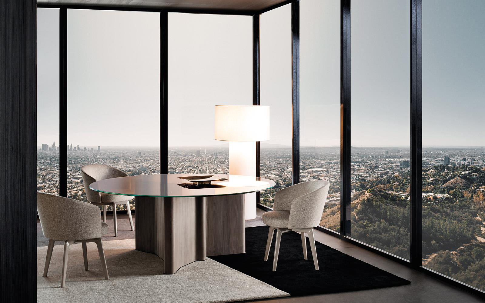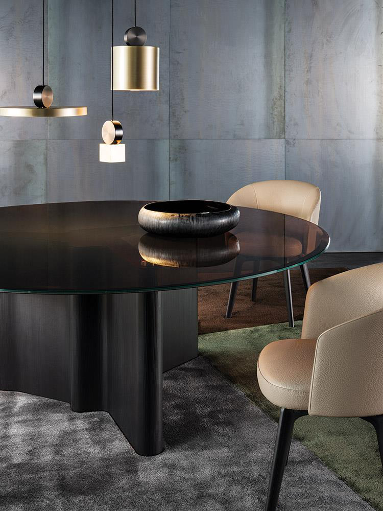The Connery seating system includes pieces that incorporate low visual impact Flap table top surfaces that lend lively rhythm to the arrangements. Made of bent 8 mm thick aluminium sheet, upholstered in leather in the style of fine leather goods, or in ash veneer with open-pore Moka colour lacquer finish.