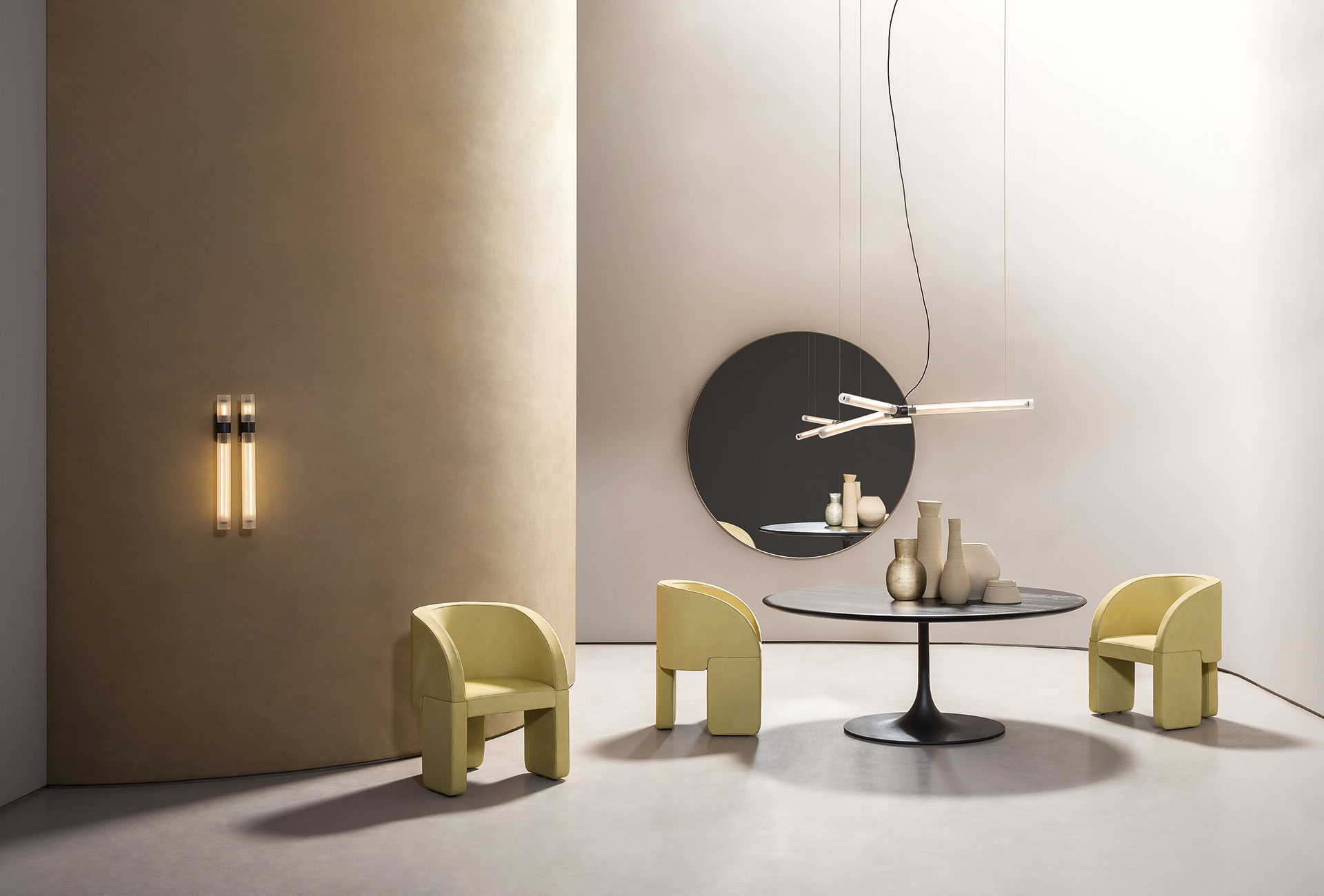Backrest and seat cushions in channeled goose down (Assopiuma Gold Label certified) undergo routine sanitization as specified in EC Regulation No. 1069/2009, with variable-density polyurethane foam insert for added softness. The seat cushion and its internal casing are crafted with a subtle quilted pattern with double embroidery and quilt stitching that highlights the linear yet soft shape of the seat.